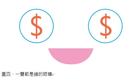 有些店職員,為了公司設定的營業目標,在這個壓力下,所有服務及銷售動作,也都向錢看齊,於是,客人進門先打量衣著、穿戴,再決定是不是要主動招呼?!有些店員,對顧客決定要買的商品,因為獎金或售價不同,一味推薦顧客買不想買的商品?!這些反應,就像極了圖四的那雙眼睛。
