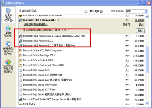 - 進入如圖3,選Microsoft .NET Framework1.1 Chinese Lang. Pack移除,再找到Microsoft .NET Framework1.1,點移除按鈕,出現下圖,點「是(Y)」按鈕,移除時間約需2-5分鐘不等,要耐心等一下。 圖3