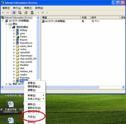 - 進入如圖8,IIS裡點網站前那 + 號,再點預設的網站前 + 號,如下圖,可以看到WebPos。 圖8、點WebPos,按滑鼠右鍵,選「內容」