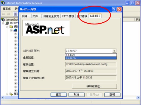 - 進入圖9,選上方「ASP.NET」那頁,即可由「ASP.NET版本」下拉看到,應選「1.14322」那個版本也表示上面安裝成功,再按「套用」,按「確定」。 圖9、進入webpos,點上面ASP.NET那一頁