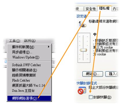 3. 在點選「隱私權」的分頁按鈕,最下方的「封鎖快選」選項,打勾取消,再按下確定的按鈕即可。