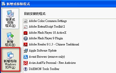 2.在 [新增或移除程式]視窗,點「新增/移除Windows元件(A)」。