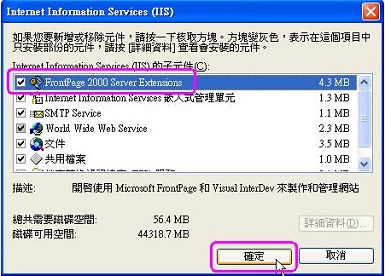 在[Internet Information Services (IIS)]視窗中,勾選 [FrontPage 2000 Server Extensions],再按下「確定」。